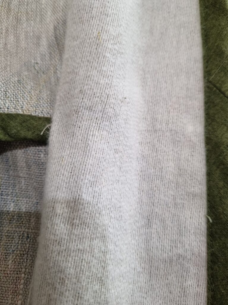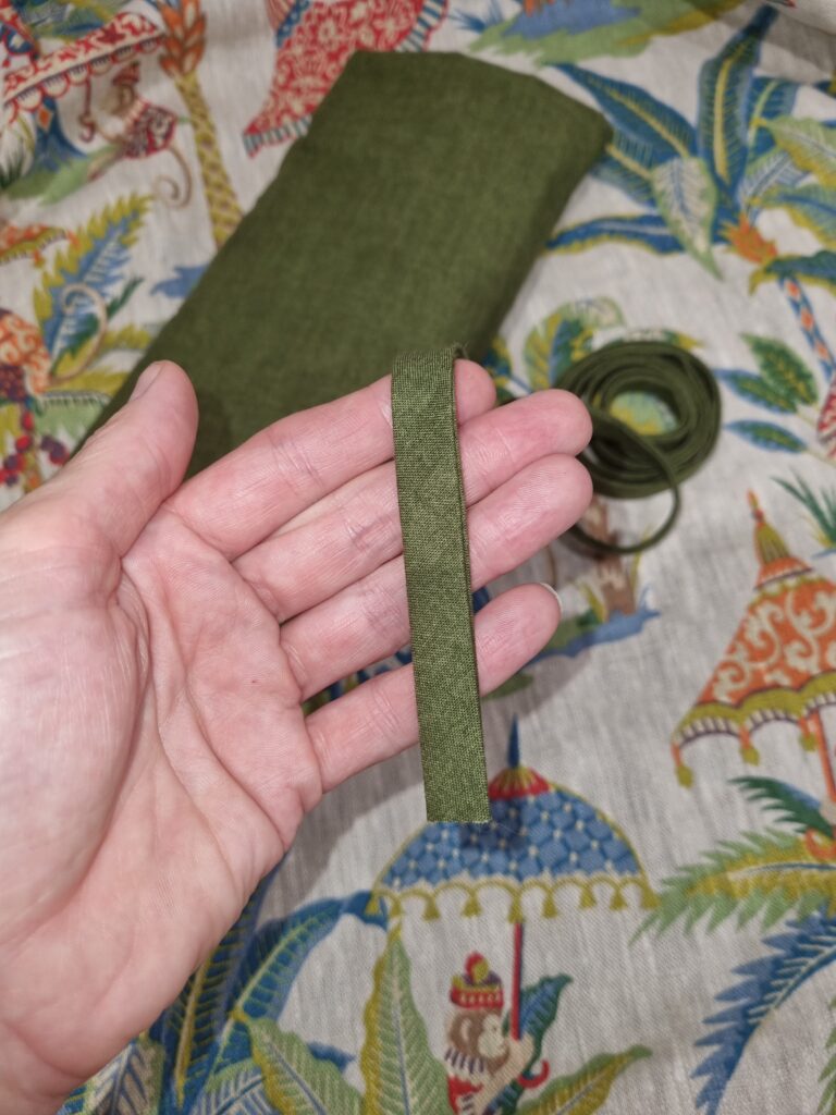 I like using bias binding for the seams, and this time I had a remnant of a lovely green Makeover quilting cotton, so I made my own 5’’ double fold bias binding. It is complimenting the main fabric really well.